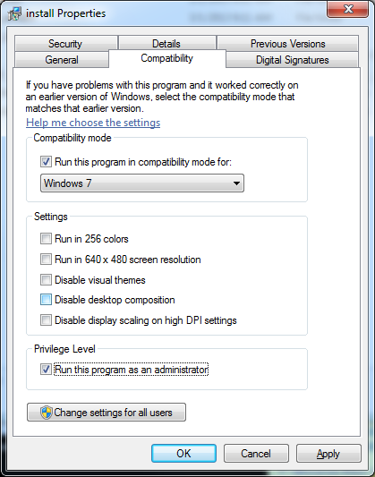 Under the Compatibility tab, look for the Compatibility Mode box, and check the Run this program in compatibility mode for: checkbox and select Windows 7 from the drop-down menu.
